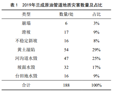 據(jù)2019年蘭成原油管道地質(zhì)災(zāi)害調(diào)查資料,甘肅段黃土地區(qū)共發(fā)育災(zāi)害188處,其中黃土濕陷54處,占發(fā)育災(zāi)害總量的29%(表 1),表明黃土濕陷發(fā)育密集、規(guī)模大,易發(fā)性高。黃土濕陷災(zāi)害由產(chǎn)生到威脅管道安全經(jīng)歷以下過(guò)程。