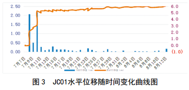 7月15日之后(鋼管樁施工完成之后),每日地表位移量很小, JC01、JC03、JC04平均每日位移量分別為0.027 mm、0.027 mm、0.026 mm,每一個(gè)基礎(chǔ)點(diǎn)都相對(duì)穩(wěn)定,沒有明顯下滑趨勢(shì)。說明滑坡體位移數(shù)據(jù)已經(jīng)趨于收斂,滑坡已經(jīng)趨于穩(wěn)定。