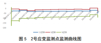通過監(jiān)測(cè)數(shù)據(jù)表明,2019年8月1日后,1號(hào)應(yīng)變監(jiān)測(cè)點(diǎn)和2號(hào)應(yīng)變監(jiān)測(cè)點(diǎn)數(shù)據(jù)變化不明顯(圖 4、圖 5),各點(diǎn)的整體趨勢(shì)基本一致,應(yīng)變區(qū)間為﹣178~78,占極限值的7.73%,未達(dá)到關(guān)注級(jí)。