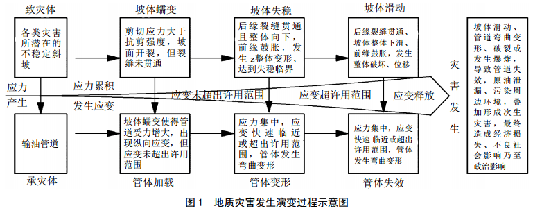 延緩發(fā)育性管道地質(zhì)災(zāi)害具有明顯的“因果型災(zāi)害鏈”,只要能夠掌握致災(zāi)體與承災(zāi)體之間的因果聯(lián)系,就有可能及時(shí)預(yù)警,提前采取治理措施。圖 1以致災(zāi)體與承災(zāi)體之間的關(guān)系,描述了管道地質(zhì)災(zāi)害發(fā)生的演變過程。