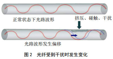 當(dāng)光信號輸送進(jìn)光纖時,系統(tǒng)軟件探測器會處理接收到的光信號的相位,當(dāng)傳感光纜受到觸碰或振動的干擾時,光信號的傳輸模式就會發(fā)生變化(圖 2)。