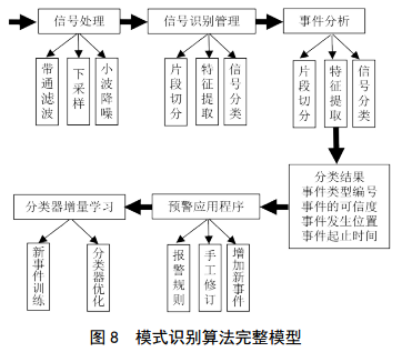 若在使用中系統(tǒng)智能識別存在偏差,可以進(jìn)行人工修訂,對事件進(jìn)行重新訓(xùn)練,更新數(shù)據(jù)庫,從而達(dá)到盡量準(zhǔn)確的對事件進(jìn)行分析、報警目的。模式識別算法完整模型如圖 8所示。