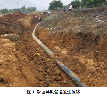 圖 1為臨近道路施工誘發(fā)山體滑坡,開挖后的管道發(fā)生明顯移位。圖 2為某管道山地敷設(shè)段因滑坡而發(fā)生皺褶,引發(fā)了介質(zhì)泄漏。從山地管道失效案例可以總結(jié)管道失效原因:一是對管道受到的外部載荷估計不足,往往是管道發(fā)生事故之后,才意識到管道受到嚴重的載荷作用;二是管道的應(yīng)變能力不足,土體擾動即可能導(dǎo)致管道失效;三是管道的防護結(jié)構(gòu)(如擋土墻等)保護能力不足,某些因素可能致其先行損壞,未能對管道起到足夠的防護作用。