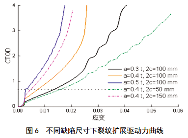 針對高鋼級管道環(huán)焊縫斷裂問題,筆者建立了基于應(yīng)變的斷裂評價方法[5],包括管道環(huán)焊縫局部力學(xué)性能測試、基于損傷的管道環(huán)焊縫有限元模型、管道斷裂韌性的約束校正等,定量管道環(huán)焊縫的應(yīng)變能力。在基于應(yīng)變的斷裂分析中,采用裂紋尖端張開角(CTOD)作為參數(shù)描述裂紋擴展驅(qū)動力和裂紋擴展阻力。圖 6是裂紋擴展驅(qū)動力曲線,隨著缺陷長度2 c(分別取值50 mm、100 mm、150 mm)及缺陷深度a(分別取值0.3 t,0.4 t,0.5 t)的增大,曲線不斷左傾,且斜率越來越大,表明環(huán)焊縫的應(yīng)變能力隨缺陷尺寸的增大而逐漸減小。
