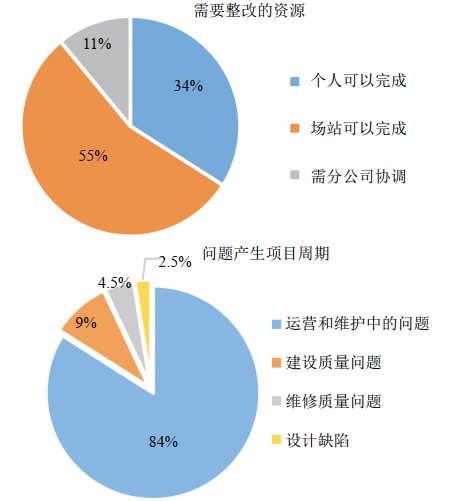 圖 4結果表明,55%為場站可以單獨完成整改的問題,應以提高場站管理水平為主要抓手。“低老壞”問題主要發(fā)生在運營和維護階段,需要采取措施提高管理水平。