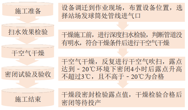 利用大排量空壓機組和空氣干燥處理裝置,持續(xù)向管道內(nèi)注入露點﹣40℃或者更低露點的干燥空氣,使殘存在管道內(nèi)的水分蒸發(fā),并把蒸發(fā)后的濕空氣置換出管道外,實施連續(xù)干燥吹掃處理,直至管道內(nèi)空氣露點達到并穩(wěn)定在﹣20℃以下。詳細作業(yè)流程見圖 2。