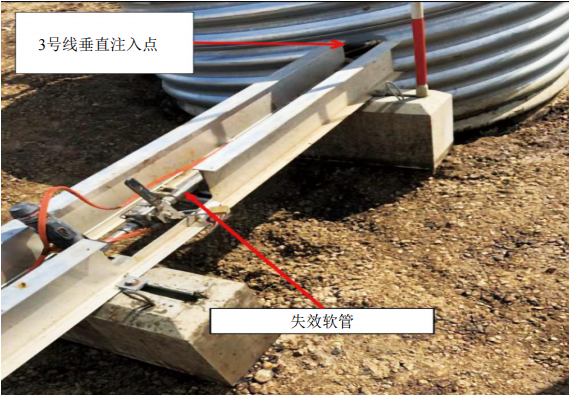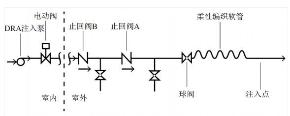 DRA注入系統(tǒng)室外管道包括19 mm的不銹鋼管和一根19 mm柔性編織軟管,并裝有電伴熱和絕熱裝置,以防DRA產(chǎn)品出現(xiàn)凝固。鋼管和軟管在支撐盤內(nèi)延伸至3號線管道的注入點(diǎn),柔性編織軟管上游設(shè)止回閥A,以防止原油從3號管道回流到DRA注入系統(tǒng)。