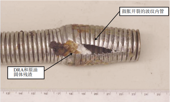直接原因。泄漏直接原因?yàn)镈RA注入系統(tǒng)球閥至注入點(diǎn)之間的柔性編制軟管破裂,原油回流所致。調(diào)查組拆除柔性編織軟管并將其送第三方開展失效分析,結(jié)果顯示,軟管的波紋內(nèi)管由316L型不銹鋼制成,沿縱向焊接中心線約有5厘米長凸起和裂縫,處于球閥附近(圖 3)。在凸起位置,軟管中塞滿了由DRA和原油殘?jiān)M成的半固態(tài)材料,因DRA伴熱系統(tǒng)發(fā)生故障導(dǎo)致凍結(jié)。檢查確定,裂縫是由316L不銹鋼波紋管焊接處的瞬時(shí)延性斷裂引起的。