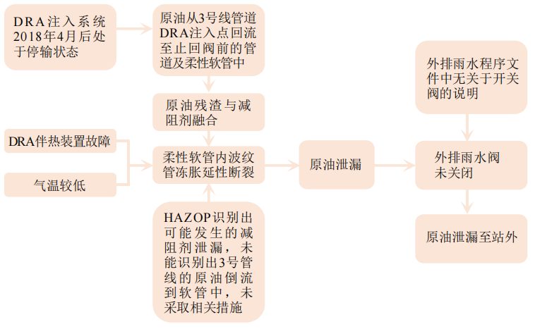 HAZOP將DRA伴熱裝置故障識別為工藝危害,可能情形為DRA注入系統(tǒng)及管道(包括19 mm柔性編織軟管)暴露在低溫下,管道或柔性編織軟管會發(fā)生凍結(jié)形成阻塞流而過壓,導(dǎo)致DRA介質(zhì)泄漏。但HAZOP并未識別出DRA注入系統(tǒng)的設(shè)計(jì)是否允許原油從注入點(diǎn)回流到止回閥,也未識別出如果包括柔性編織軟管在內(nèi)的管道凍結(jié)和破裂,可能會導(dǎo)致原油泄漏。因此,未采取任何控制措施。