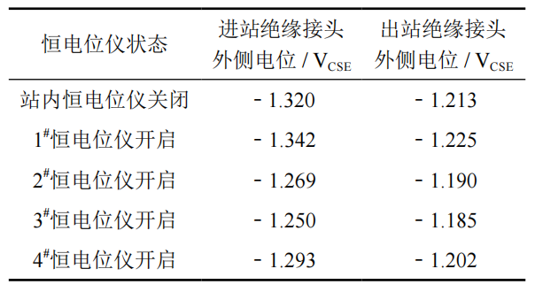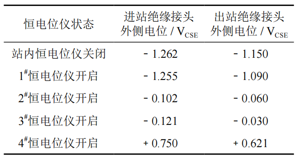 逐個開啟站內(nèi)恒電位儀,測試進出站絕緣接頭外側(cè)電位,分析治理措施實施后區(qū)域陰極保護系統(tǒng)對站外管道的雜散電流干擾情況,測試結(jié)果見表 4。在開啟站內(nèi)4路恒電位儀時,進出站管道的電位變化不明顯,表明采用分布式淺埋陽極對干線管道的干擾影響小。