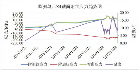 AA007-200監(jiān)測單元自投用以來各截面附加彎曲應力隨時間變化,曲線如圖 2所示。變化趨勢表明:管道在X3—X6截面間附加彎曲應力年際變化明顯,以X4截面應力變化最為顯著,拉應力為151.39 MPa,壓應力為﹣156.60 MPa,彎曲應力為158.99 MPa,拉應力位于184.49°(管底)。由于X1—X8 處于強凍脹段,管道受凍土凍脹影響易向上抬升,但受 X6—X8 段公路強約束限制,最終表現(xiàn)為 X3 截面上游管段冬季受凍土凍脹作用向上抬升,X4 截面應力在累積增大,X4截面應力隨時間變化曲線如圖 3所示。