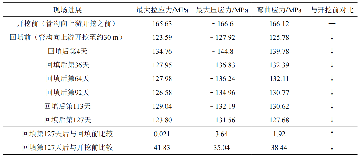 砂石路穿越段管道開挖后,監(jiān)測發(fā)現(xiàn)期間并無應力釋放,原因為X5上游段管道處于強凍脹、融沉土壤環(huán)境中,受砂石路約束后管道部分變形在已彎曲段形成積累,造成X3—X5應力逐年增大。盡管在設置板涵后可以消除砂石路的強約束,但對于已累積較高應力的X3—X5段管道起不到快速釋放應力的作用,遂決定管溝開挖從X5向上游延伸30 m至X3附近,經監(jiān)測確定X4附近應力得以降低,回填管溝,結果如表 2所示。隨著時間的推移,累積較高應力的X3—X5段管道也在設置的板涵作用下應力得到有效釋放。