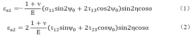 假定試樣表面平面應力狀態(tài)下,表面法線方向的剪切應力τ13、τ23為零,即殘余應力的計算表述為:
