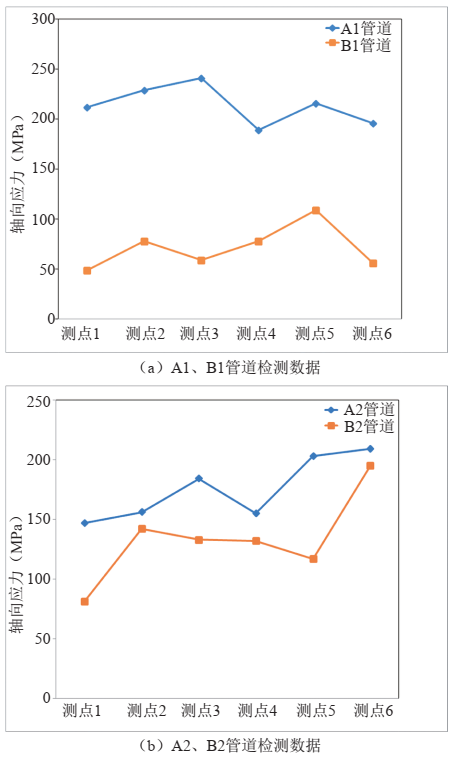 圖 3 A、 B兩廠4條管道應力檢測數(shù)據(jù)