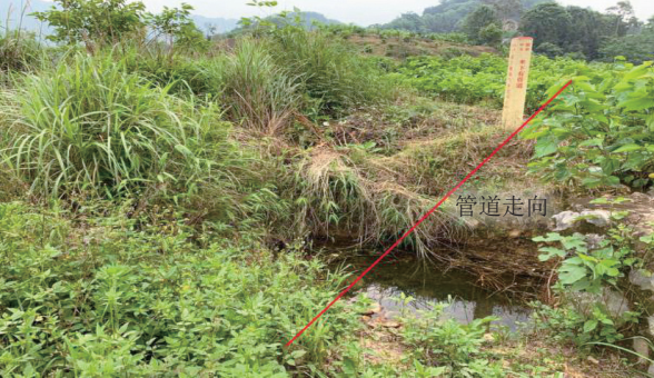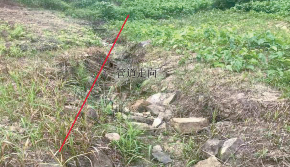 (3)巖溶塌陷。巖溶塌陷主要發(fā)生在巖溶地區(qū)。巖溶結構上方土體受自然或人為因素影響而變形破壞,會在地面形成塌陷坑、洞、槽等,并伴有裂縫、局部下沉,或有地下水從地面向上涌出等特征[4]。建設期,管溝采用石方回填,回填土長期遭受地下水浸蝕,也會發(fā)育巖溶塌陷。巖溶塌陷會導致管道上方覆土流失,造成管道埋深不足、露管。嚴重時甚至造成管道懸空(圖 4)。