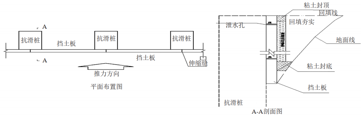 實踐證明,將排水溝(圖 5)、錨固、抗滑樁(圖 6)、擋土墻(圖 7)、削方減載壓腳等,兩種及以上措施相結合用以治理滑坡、不穩(wěn)定斜坡,可取得良好成效。坡面水毀治理常采用截排水溝、擋墻、截水墻等。河溝道水毀主要采用護岸(圖 7)、過水面、地下防沖墻等措施。修建水工保護設施要結合地質特征、特點,因勢利導,要以疏水排水為原則,堅決不能以堵代疏。巖溶塌陷常采用清除填堵、灌漿加固、結構跨越的方式進行處理。小型塌陷一般以清除填堵為主。開挖難度較大的塌陷可將水泥砂漿、混凝土等材料通過巖溶洞口灌入洞隙中,以強化土層、洞空填充物,隔斷地下水通道。采用疏、導、排、圍等措施以阻止地表水下滲也很重要。