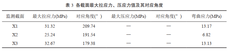 如圖 3所示,在管道外壁A、B、C 3個監(jiān)測點安裝應變計測量各點應變值,即可計算管道截面內(nèi)任意點的應變值大小,由胡克定律,計算得到監(jiān)測截面的最大應力值。據(jù)此可長期監(jiān)測管道截面實時應力大小及變化趨勢。按照QSY 1672―2014《管道滑坡災害監(jiān)測規(guī)范》,將管道地質(zhì)災害風險分為藍色、黃色、紅色三個等級預警,對應的管道附加應力達到管道拉(壓)應力允許值分別為30%、60%、90%。