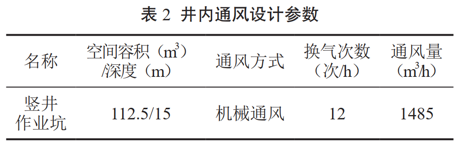 (1)通風(fēng)設(shè)施。施工豎井作業(yè)坑深16 m,井下自然空氣中含氧量較少,且修復(fù)對(duì)象為輸油管道,容易產(chǎn)生油氣揮發(fā)和聚集,影響井下作業(yè)人員安全。采用井下操作面送風(fēng)的機(jī)械通風(fēng)方式,將風(fēng)機(jī)置于井口外側(cè)2 m處,送風(fēng)管道沿豎井內(nèi)壁臨時(shí)固定、敷設(shè)至井底操作面0.5 m高位置,將井外新風(fēng)送至井底操作面,使操作面空氣及時(shí)得到凈化(表 2)。