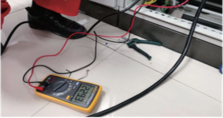 空載試驗(yàn)即STS輸出端無(wú)負(fù)載工況下,將STS輸出端與萬(wàn)用表連接的同時(shí),斷開圖 1中UPS線纜即M1進(jìn)線,觀察萬(wàn)用表測(cè)量值有無(wú)中斷現(xiàn)象,如圖 2所示。待載試驗(yàn)即STS輸出端供電PLC本地0#機(jī)架工況,斷開機(jī)架冗余電源模塊中的任意一塊,基于在用電源模塊掉電,控制器實(shí)現(xiàn)主備切換,開展UPS掉電STS無(wú)間斷切換市電試驗(yàn)。