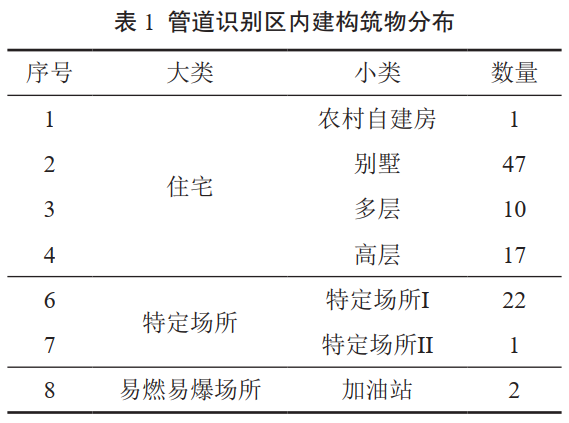 西氣東輸甪寶線昆山高新區(qū)和巴城段(KS037-KS54)長5.4 km,管道外徑610 mm,壁厚8 mm,管材采用X65鋼,設(shè)計壓力4 MPa,運行壓力3.5 MPa,外加三層PE,管道陰極保護(hù)為強制電流保護(hù)[15]。管道周邊有居民區(qū)、工廠、學(xué)校、加油站、高速公路、河流、湖泊等,人口密度較高、交通頻繁。經(jīng)現(xiàn)場核實確認(rèn),得到表 1所示管道識別區(qū)內(nèi)建構(gòu)筑物分布情況(潛在影響半徑121 m,識別半徑200 m)。