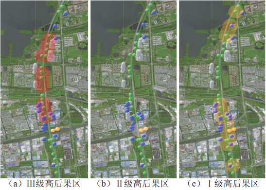 基于python對住宅、特定場所、易燃易爆場所分別進(jìn)行聚類、簇合并和等級判定操作(半徑L=200,N=5),利用地圖可視化組件folium得到圖 5所示初步劃分的高后果區(qū)識別圖,其中Ⅲ級高后果區(qū)3個,Ⅱ級高后果區(qū)1個,Ⅰ級高后果區(qū)4個。