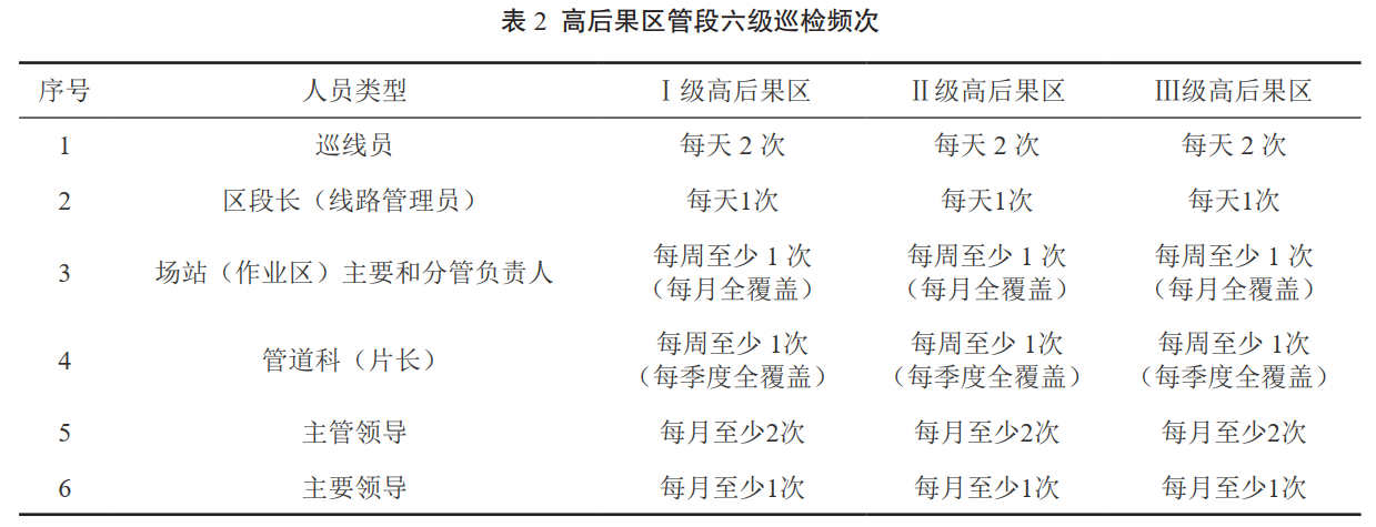 巡護(hù)質(zhì)量達(dá)標(biāo)。高后果區(qū)管段實(shí)行六級(jí)巡護(hù)制度。分為巡線工、區(qū)段長(線路管理員)、作業(yè)區(qū)、管道科、主管領(lǐng)導(dǎo)、主要領(lǐng)導(dǎo)六個(gè)層級(jí),分別按照不同要求開展巡護(hù),實(shí)時(shí)掌握高后果區(qū)風(fēng)險(xiǎn)動(dòng)態(tài),并留存巡檢記錄。具體巡檢頻次見表 2。