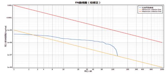 圖 5紅色曲線為1E-6/a個人風險等值線,根據(jù)GB 36894―2018《危險化學品生產(chǎn)裝置和儲存設施風險基準》3.2 防護目標個人風險基準,該高后果區(qū)新建酒店(大于100人)為一般防護目標中的一類防護目標3E-6/a(藍色曲線),處于個體風險可接受區(qū)內(nèi)。從圖 6可以看出 ,該高后果區(qū)傷亡2~120人的社會風險曲線,處在GB 36894―2018社會風險基準的盡可能降低區(qū)。