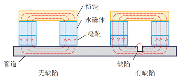圖 1給出了漏磁檢測基本原理示意圖[4,5]:磁化器中的永磁鐵產(chǎn)生磁場,并通過極靴、銜鐵和管道形成完整的磁回路。由于管材的磁導(dǎo)率遠(yuǎn)大于空氣,當(dāng)管壁無缺陷時,通過管道的磁感線大多被約束在管壁內(nèi)部。而當(dāng)管道出現(xiàn)凹坑、裂紋等切割磁力線的缺陷時,由于缺陷處磁阻遠(yuǎn)遠(yuǎn)大于管材,會使部分磁感線從管壁漏出,形成漏磁場,可被管道上方的磁敏感傳感器接收,通過檢測到的相關(guān)信號的變化,可對缺陷的幾何特征及位置進(jìn)行分析與判別。