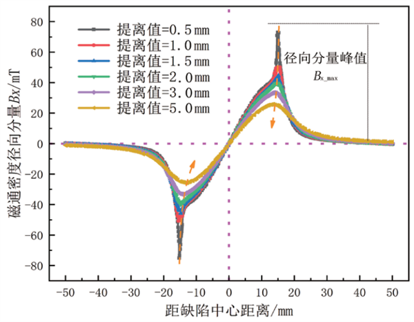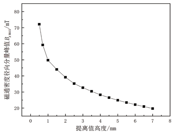從圖 3可以看出,隨著提離值的增高,磁通密度徑向分量明顯降低。這是由于空氣中磁阻較大,磁力線趨向于從磁阻小的管壁內(nèi)通過,提離值越高,距離管壁越遠(yuǎn),磁力線分布越稀疏,故而磁通密度越小。同時,由圖 4結(jié)果可以看出:磁通密度徑向分量峰值(取值方法如圖 3所示)隨提離值增高呈非線性衰減趨勢,且在提離值較低時,衰減速率較快,隨提離值增高,衰減速率逐漸變緩,該結(jié)果與文獻(xiàn)[8]中的結(jié)果是一致的。