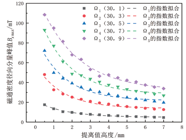 (2)指數(shù)擬合可以較好地表征磁通密度徑向分量峰值Bx_max隨提離值增高而衰減的變化趨勢。