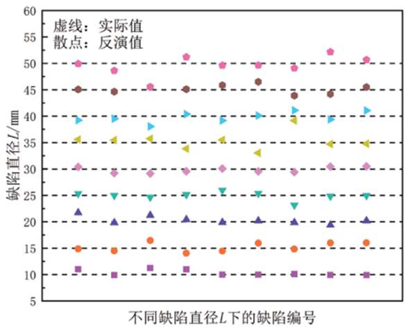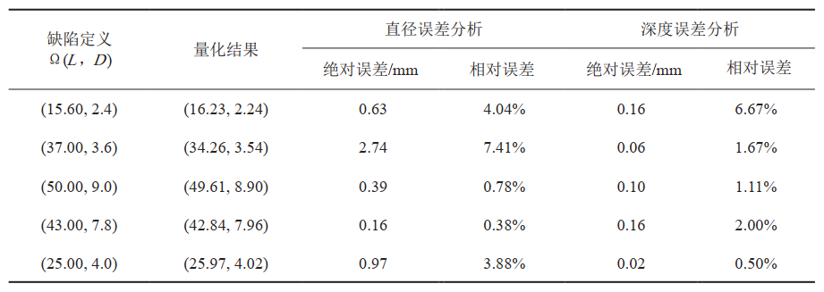 圖 8中虛線表示缺陷的實(shí)際尺寸,樣本點(diǎn)表示通過神經(jīng)網(wǎng)絡(luò)算法進(jìn)行缺陷反演得到的缺陷尺寸。由結(jié)果可以看出,本文的反演方法可以準(zhǔn)確地量化缺陷尺寸,相對誤差幾乎都在10%以下,絕大部分誤差在5%左右。同時,為進(jìn)一步驗(yàn)證此反演方法的可靠性和準(zhǔn)確性,本文隨機(jī)選取了5組缺陷帶入訓(xùn)練結(jié)果進(jìn)行反演,得到結(jié)果如表 2所示。可見,本文提出的缺陷量化方法精確度較高,可為實(shí)際工程中缺陷反演提供新的思路和理論支持。