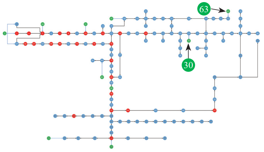 本文通過對某天然氣管網(wǎng)供氣可靠性進(jìn)行實例計算,對本方法的可行性進(jìn)行驗證。該管網(wǎng)有138條管道,24個壓縮站(紅色點表示)和10個氣源(綠色點表示),拓?fù)浣Y(jié)構(gòu)如圖 2所示。其中節(jié)點63和30分別表示LNG接收站和地下儲氣庫。
