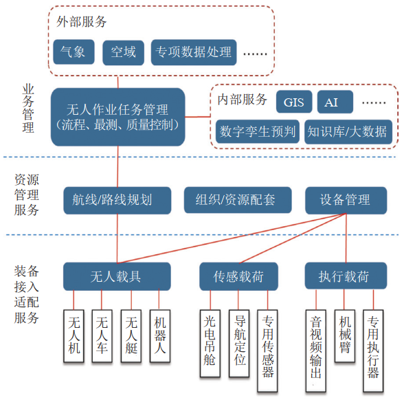 (3)業(yè)務(wù)管理層。實現(xiàn)對作業(yè)過程的管控以及提供各類數(shù)據(jù)服務(wù)。作業(yè)任務(wù)管理是核心,集成了不同無人作業(yè)過程的流程控制、操作執(zhí)行規(guī)則、局部和全局的質(zhì)量標(biāo)準(zhǔn)和異常狀態(tài)邊界條件等。圍繞作業(yè)任務(wù)管理,需要GIS(地理信息系統(tǒng))、人工智能分析、數(shù)字孿生預(yù)判、專業(yè)知識庫/大數(shù)據(jù)分析等內(nèi)部服務(wù)提供輔助數(shù)據(jù)支撐。業(yè)務(wù)管理層應(yīng)具備開放性,用于接入平臺尚未集成的數(shù)據(jù)服務(wù)或社會公共數(shù)據(jù)服務(wù)(如氣象、空域信息)。
