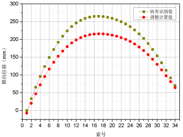 根據(jù)最近一次的檢測(cè)結(jié)果可知,現(xiàn)有結(jié)構(gòu)最大橫向偏位266 mm,發(fā)生在第13#—14#吊桿處。橫向偏位病害識(shí)別主要通過(guò)增加單側(cè)風(fēng)纜主纜無(wú)應(yīng)力長(zhǎng)度來(lái)進(jìn)行,計(jì)算結(jié)果表明,單側(cè)風(fēng)纜主纜無(wú)應(yīng)力長(zhǎng)度增加180 mm時(shí),跨越結(jié)構(gòu)主梁橫向產(chǎn)生265 mm位移,識(shí)別結(jié)果如圖 4所示。