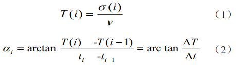式中:σ( i )為勻速變形某一單位時間段(一般采用一個監(jiān)測周期,如1天、1周等)內(nèi)管道應(yīng)力增長量,MPa;v為勻速變形階段的應(yīng)力變化速率,MPa/周期;T( i )為變換后與時間相同量綱的縱坐標(biāo)值;αi為改進的切線角,°;ti為某一監(jiān)測時刻;Δt為時間段;ΔT為Δt時間段內(nèi)T( i )的變化量。
