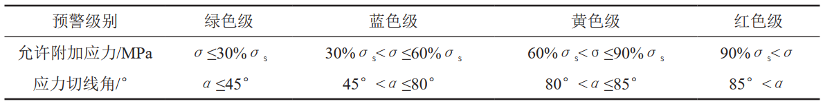 根據(jù)文獻[5],滑坡在初始變形階段時,切線角為小于45°,到等速變形階段,切線角約等于45°,這兩種變形狀態(tài)下管道都處于相對安全的狀態(tài),預(yù)警為綠色級;滑坡初加速階段時,切線角大于45°,報藍(lán)色級預(yù)警;中加速階段時,切線角變化約為80°到85°,報黃色預(yù)警;當(dāng)切線角大于85°時報紅色預(yù)警。考慮到管道應(yīng)力變化時管道的安全性,將管道預(yù)警附加應(yīng)力與切線角預(yù)警級別相結(jié)合,以最不利原則作為管道力學(xué)預(yù)警模型的最終級別,如表 1所示。