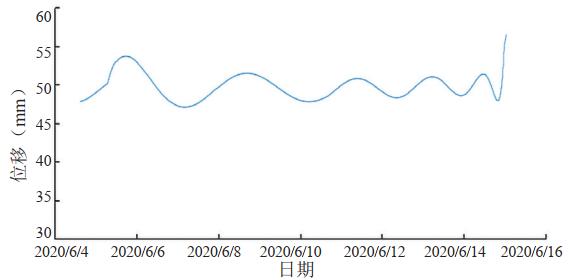選取6月上旬到發(fā)生預(yù)警時間段的地表位移計監(jiān)測值進行分析(圖 2),經(jīng)切線角理論改進得到的T- t 曲線與相應(yīng)的切線角(圖 3),管道應(yīng)力值曲線(圖 4),轉(zhuǎn)化得到的T- t 曲線與切線角曲線(圖 5)。