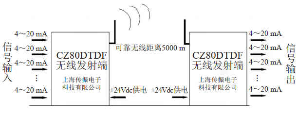 (2)無(wú)線傳輸和接收。CZ80DTD是一款無(wú)需布線即可遠(yuǎn)傳模擬量而精心設(shè)計(jì)的工業(yè)級(jí)產(chǎn)品,包括發(fā)射端和接收端兩部分。發(fā)射端由數(shù)據(jù)采集板和 DTD 無(wú)線傳輸模塊組成,負(fù)責(zé)采集數(shù)據(jù);接收端由數(shù)據(jù)轉(zhuǎn)換板和 DTD 無(wú)線傳輸模塊組成,負(fù)責(zé)接收并還原數(shù)據(jù)。該設(shè)備具有零調(diào)試、高精度(0.15%)、上電自動(dòng)連接/無(wú)需外部網(wǎng)絡(luò)或電臺(tái)等特點(diǎn)。數(shù)據(jù)終端由工業(yè)級(jí)模塊和高速單片機(jī)系統(tǒng)兩大部分組成,利用無(wú)線網(wǎng)絡(luò)技術(shù),以點(diǎn)對(duì)點(diǎn)方式將模擬量遠(yuǎn)傳至終點(diǎn),同時(shí)再以模擬量形式輸出并供給后端采集器,如圖 4所示。該系統(tǒng)采集傳輸一體化,具有高度集成特點(diǎn),在降低成本的同時(shí)也提高了系統(tǒng)可靠性;具有較強(qiáng)的環(huán)境自適應(yīng)能力,能在5 km距離內(nèi)提供較高質(zhì)量的信號(hào)傳遞服務(wù),完全滿足現(xiàn)場(chǎng)機(jī)組到站控室的距離。