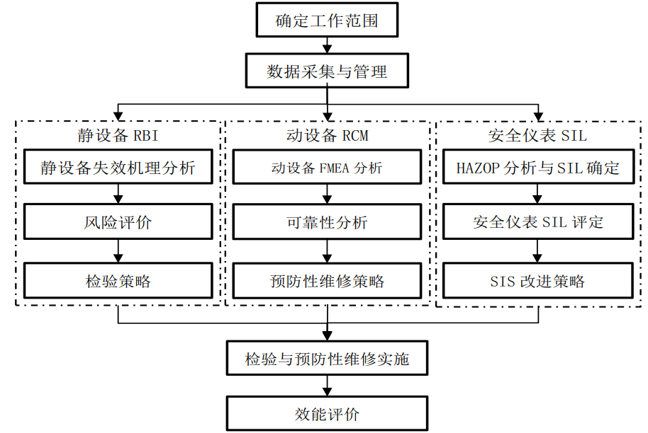 可劃分為5個(gè)主要環(huán)節(jié)并循環(huán)執(zhí)行,如圖 1所示。針對靜設(shè)備RBI、動(dòng)設(shè)備RCM、安全儀表系統(tǒng)SIL等均有相應(yīng)工作流程,如圖 2所示。