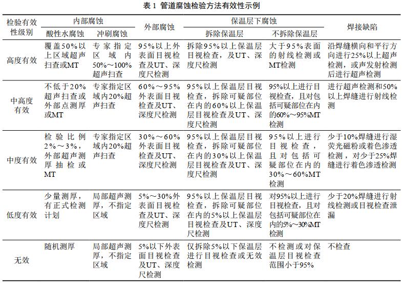 某油田站場靜設(shè)備主要包括承壓管道、承壓容器及常壓儲(chǔ)罐等,以管道腐蝕檢驗(yàn)為例,其方法有效性如表 1所示。