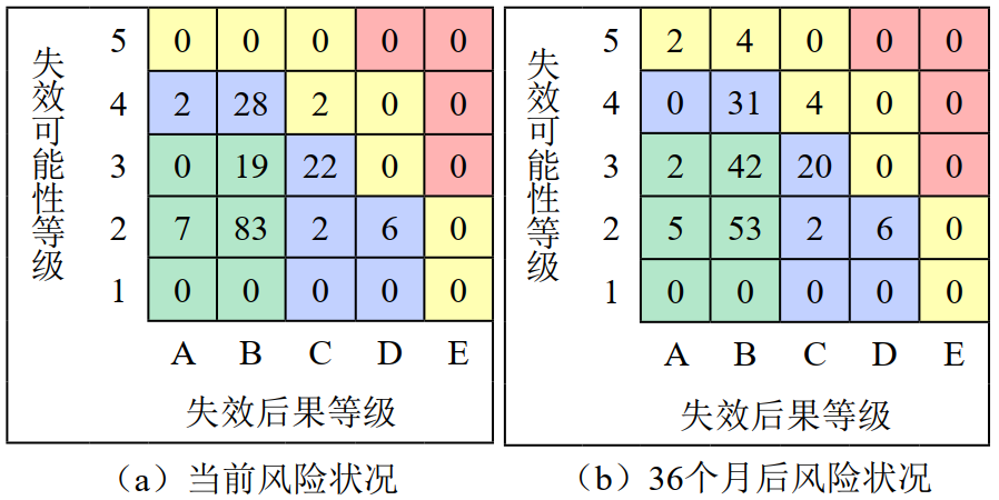 根據(jù)需求采用定性或定量風(fēng)險(xiǎn)評價(jià)方法確定設(shè)備風(fēng)險(xiǎn)值,參考GB/T 26610―2014《承壓設(shè)備系統(tǒng)基于風(fēng)險(xiǎn)的檢驗(yàn)實(shí)施導(dǎo)則》中失效可能性定量分析方法和失效后果定量分析方法評估設(shè)備風(fēng)險(xiǎn)可接受性。全部設(shè)備單元的風(fēng)險(xiǎn)評價(jià)結(jié)果進(jìn)行等級劃分后以風(fēng)險(xiǎn)矩陣展示,如圖 3所示。