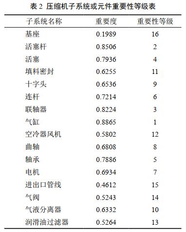 以某雙列雙級對置平衡式往復(fù)壓縮機(jī)為例,工作排量15.2 m3/h,二級出口壓力0.55 MPa,其典型故障包括氣閥、彈簧、活塞環(huán)故障,機(jī)組振動(dòng),活塞桿發(fā)熱、磨損、斷裂,氣缸磨損等故障模式。由表 2可以看出,對壓縮機(jī)部件進(jìn)行重要性評價(jià),重要性級別相對低的部件通常采用事后維修;重要性級別高的部件是維護(hù)重點(diǎn),需通過分析確定維修策略。該壓縮機(jī)17個(gè)元部件參與分析,約含47個(gè)故障模式,其中活塞桿、連桿、氣缸和軸承等是壓縮機(jī)系統(tǒng)中風(fēng)險(xiǎn)等級相對較高的元部件。可依據(jù)風(fēng)險(xiǎn)等級的高低來確定響應(yīng)的維修方式。