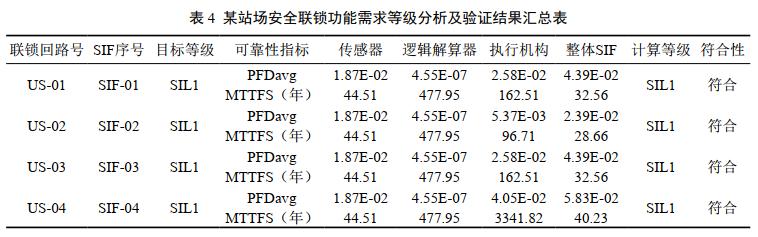 根據(jù)PFD圖、PID圖、聯(lián)鎖系統(tǒng)邏輯圖和SIS設(shè)置要求,分析確認(rèn)SIF和硬件冗余設(shè)置,采用Markov模型計(jì)算可靠性指標(biāo),根據(jù)分析結(jié)果確定符合性并形成結(jié)論和改進(jìn)建議。某站場設(shè)置4項(xiàng)安全聯(lián)鎖功能的目標(biāo)需求等級和計(jì)算等級匯總?cè)绫?#8197;4所示。