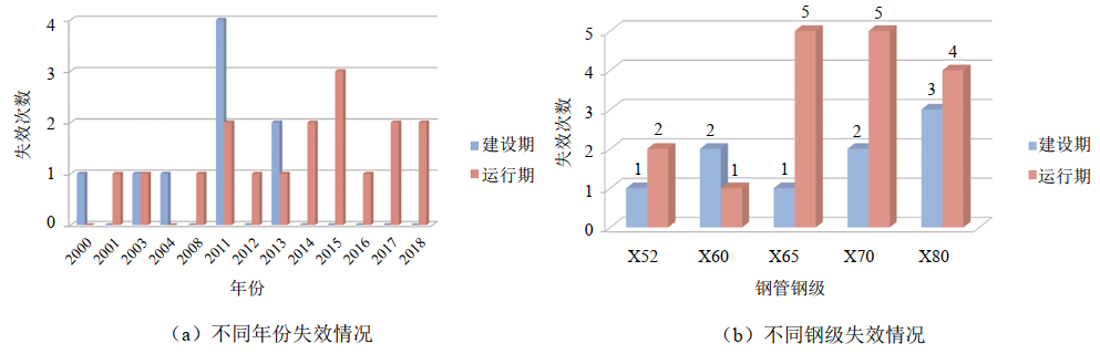 過(guò)去20年,國(guó)內(nèi)發(fā)生了多起天然氣管道環(huán)焊縫失效事故,建設(shè)期和運(yùn)行期均有,涉及X52至X80等不同鋼級(jí)管道,其中以X65至X80鋼級(jí)居多,見(jiàn)圖 1。從失效發(fā)生時(shí)間看, 2011―2018年發(fā)生較多,但需要指出這段時(shí)間管道建設(shè)里程較長(zhǎng)且高鋼級(jí)管道占比也較高,許多管道在建設(shè)期或投產(chǎn)初期就發(fā)生了環(huán)焊縫失效[1]。