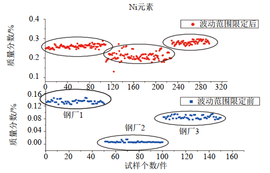圖 1 Mo和Ni合金元素含量波動范圍前后對比情況