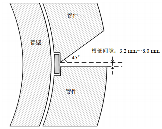 (2)接頭設(shè)計。全包式管件上下護(hù)板的倒角和坡口形式[3]規(guī)定,上護(hù)板坡口為45°,下護(hù)板無坡口,橫焊縫根部的間隙應(yīng)控制在3.2 mm~8.0 mm之間[3],橫焊縫接頭設(shè)計形式如圖 1所示。