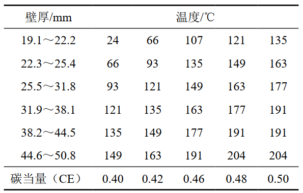 (3) 預(yù)熱溫度。阿美標(biāo)準(zhǔn)推薦的橫焊縫預(yù)熱溫度[2]如表 1所示,需結(jié)合對全包管件壁厚的要求[3]。