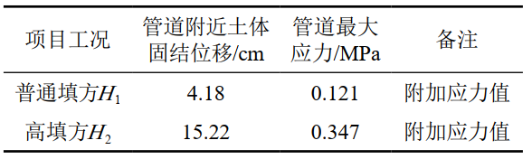由于管道下部欠固結(jié)土的不均勻沉降,將引起其中敷設(shè)管道的受力不均。對(duì)于填方4 m(H1)和14 m(H2)的土體,其沉降值有明顯差異,如表 2所示。本文采用有限元計(jì)算方法(圖 2),計(jì)算不同高度回填土的土體沉降值和由此產(chǎn)生的管道附加應(yīng)力值。