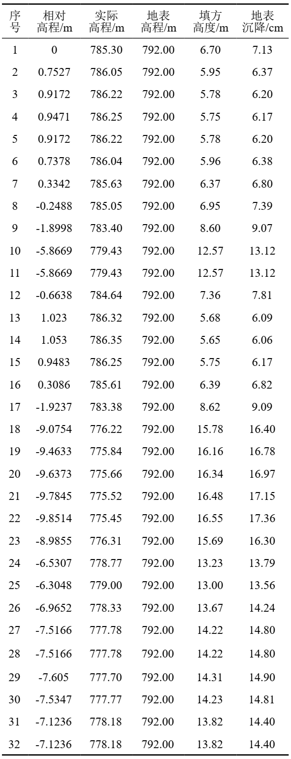 根據(jù)有限元應(yīng)變計(jì)算結(jié)果,得到不同高度填方的管道關(guān)鍵節(jié)點(diǎn)處地表沉降值,如表 4所示。