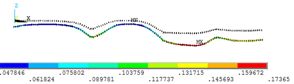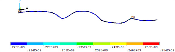 高填方區(qū)管道除了受內(nèi)壓、溫差、走向變化影響外,同時(shí)受土體不均勻沉降的作用;輸氣管道最大位移范圍為0.04 m~0.17 m,最大應(yīng)力點(diǎn)組合應(yīng)力值為254 MPa(圖 5),最大組合應(yīng)力雖略有增高,但遠(yuǎn)小于X80鋼管材質(zhì)允許極限應(yīng)力值(499.5 MPa),可判定管道運(yùn)營(yíng)處于安全狀態(tài)。
